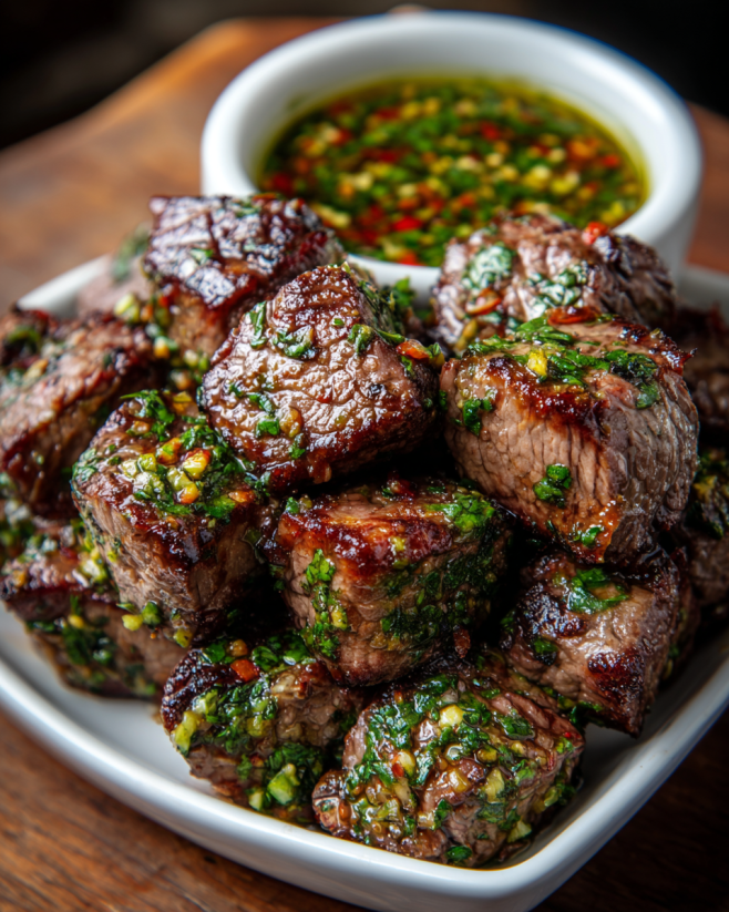 4. Serve the steak bites on a platter, drizzled with chimichurri sauce and additional sauce on the side for dipping.
