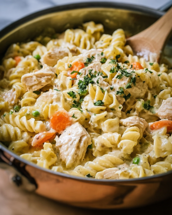 A comforting dish that combines the heartiness of chicken pot pie with pasta, featuring tender rotini, succulent chicken, and a rich creamy sauce.