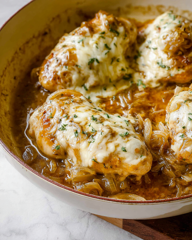 Creamy French Onion Chicken Recipe. This dish is not just a meal; it’s an experience that brings warmth and comfort to your dining table. With its rich flavors and creamy texture, it’s sure to become a family favorite. Whether you’re cooking for a special occasion or a cozy weeknight dinner, this recipe is perfect for any setting.