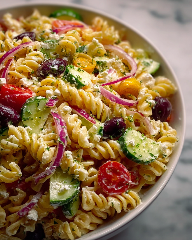 While the pasta is cooling, you can prepare the creamy dressing. In a medium-sized bowl, combine the Greek yogurt, mayonnaise, Dijon mustard, apple cider vinegar, and garlic powder. Whisk these ingredients together until the mixture is smooth and creamy. Don’t forget to season with salt and pepper to taste. This dressing is what makes your pasta salad rich and flavorful!