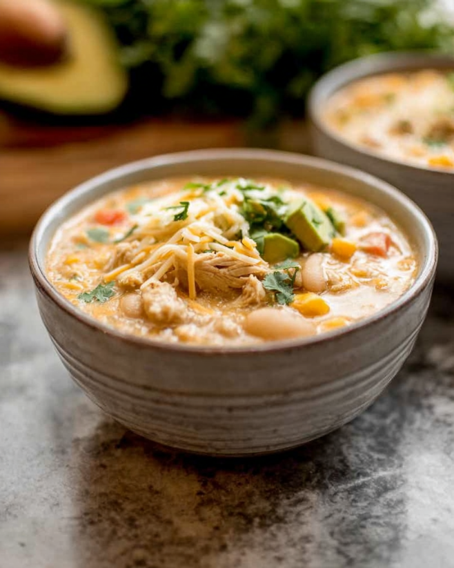 A comforting and creamy chili made with chicken, white beans, and spices, perfect for chilly evenings.