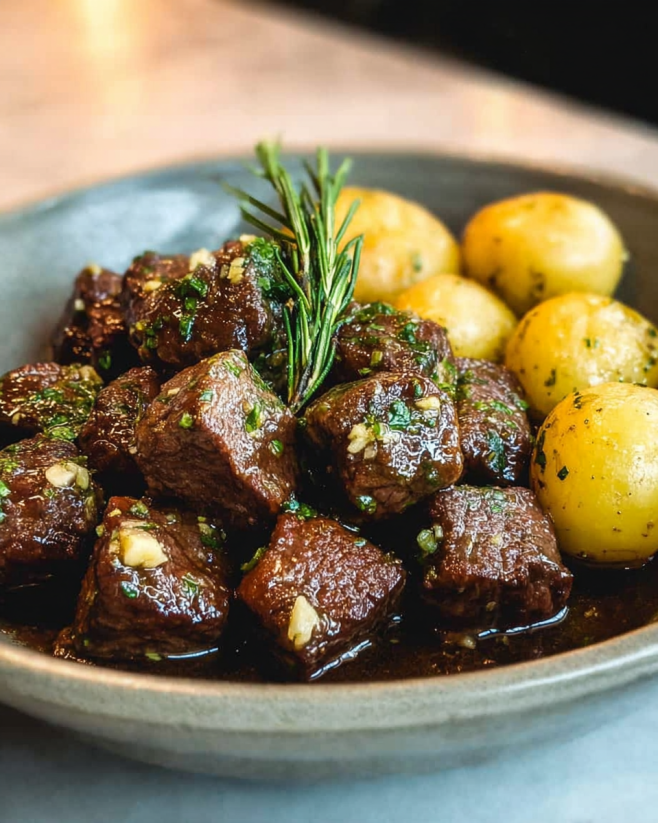 A delicious and easy meal combining tender beef bites with crispy potatoes in a rich garlic butter sauce.