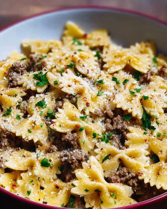 A delicious and easy meal combining garlic, butter, bowtie pasta, and ground beef, perfect for busy weeknights or cozy weekends.