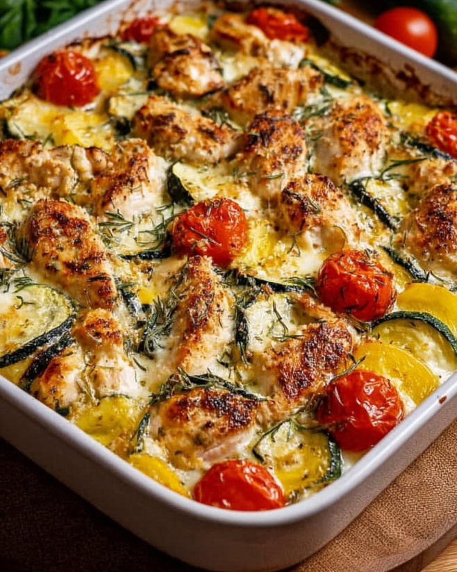 A delicious and healthy Mediterranean Chicken Zucchini Bake that combines chicken, zucchini, and vibrant Mediterranean flavors.