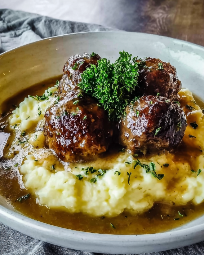 Salisbury Steak Meatballs with Garlic Mashed Potatoes delight!